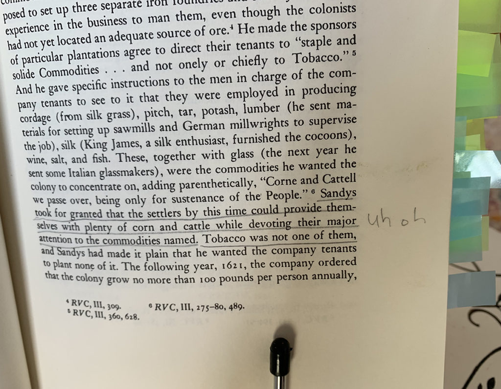 Morgan reviews the first ten years of the Jamestown settlement to explore why the colonists did not grow food for themselves and learn to prosper in the new land. The English were “unwilling or unable to feed themselves” and forever altered their good relationship with the Indians by bullying them for corn—or outright stealing or destroying it, as well as the Indians themselves. This was largely due to the terrible organization and direction of the settlement.